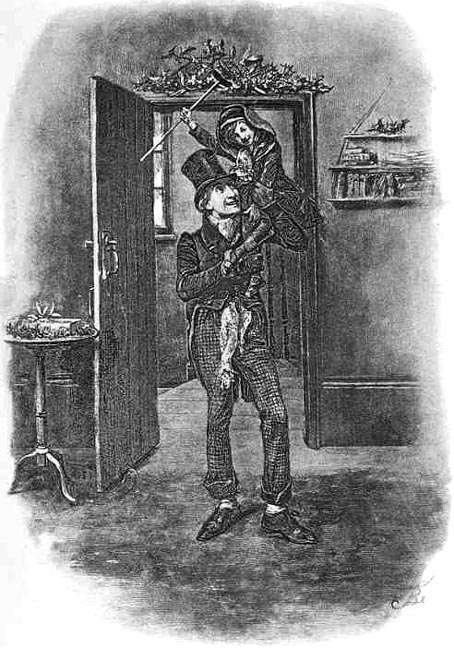 Bob Cratchit and Tiny Tim, who walks with a cane, as illustrated by Fred Barnard. The Cratchits cannot afford adequate medical care for Tim. Photo: Wikimedia